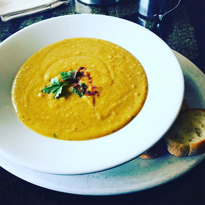 Orange Lentil Soup Topped with Pumpkin Seeds